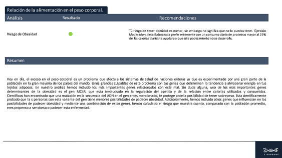 Nuestra prueba considera 35 variantes dentro las cuales destacan: Riesgo de padecer sobrepeso, respuesta del cuerpo ante grasas saturadas, respuesta del cuerpo ante carbohidratos, factores que determinan el funcionamiento del metabolismo, capacidad de metabolizar la azúcar, triglicéridos y azúcar en sangre, tendencia a tener antojos dulces, tendencia rápida o lenta para saciarse con los alimentos, capacidad física para metabolizar el alcohol y cafeína, exposición física al estrés oxidativo, tipo de estructura muscular, capacidad aeróbica, tendencia a lesiones, entre otros. .
